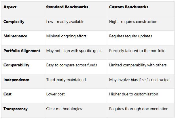 Choosing between standard and custom benchmarks depends on how accurately you want to measure your portfolio's performance. Each option has its strengths and limitations.