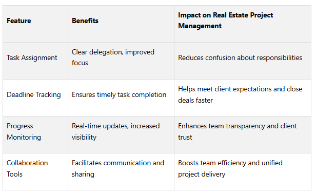 Features like task management and accountability tools ensure that projects stay on track. Clear task assignment eliminates confusion about responsibilities, while deadline tracking helps teams meet expectations and close deals more efficiently.