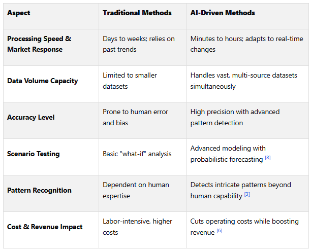 When comparing AI-driven methods to traditional forecasting, the differences are striking. Here's a breakdown of how these approaches stack up: