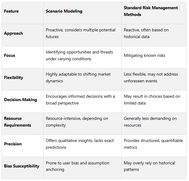 Comparing scenario modeling to traditional risk management methods reveals the trade-offs that influence portfolio strategies. Each approach has unique strengths and weaknesses, shaping how they impact investment decisions.