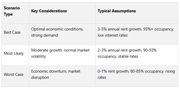 Start by building a baseline scenario that reflects current market conditions, including property values, rental rates, occupancy levels, and economic indicators. Use this as a foundation to develop best-case, worst-case, and most likely scenarios.