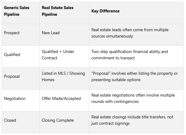 Real estate pipelines are more complex than traditional sales pipelines due to the involvement of multiple stakeholders, financing contingencies, and regulatory requirements. Here's how they compare: